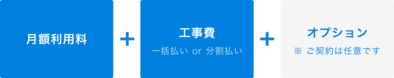 工事費のお支払いについては一括払いと分割払いがお選びいただけます。分割の場合は毎月の月額利用料と合算でのお支払いになります。オプションサービスをお申し込みの場合は別途費用が発生いたします。