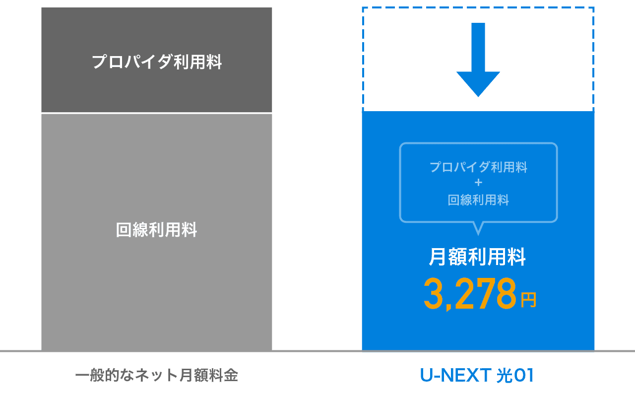 U-NEXT光01はプロバイダ料と回線費用がセットになったお得なサービスです。それぞれ別の会社と契約する煩わしさもありません。